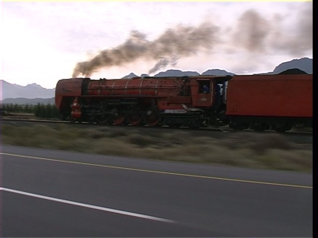 Muizenburg 26 May 2002 The first day of this tour kicked off with a trip from Simonstown back to Cape Town behind 16D 860. Hauling a side-door suburban, a lounge and another suburban, the 16D stack talk sounded great as she performed for the cameras along the scenic coastal line in the Cape winter sunshine. Later on 860 hauled the Union Limited from Cape Town station to Dal Josafat. All pictures Copyright © 2002 Trevor Staats |