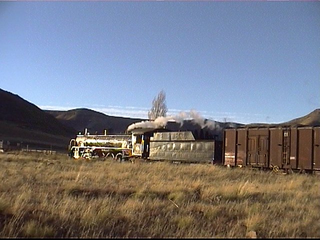 nice shots, although standing atop the cliffs was very windy. The train picked us up at 4th Reverse again and we set off for Motkop, with one runpast on the way (so-so). At Motkop the loco was turned and watered and the train shunted around to put the coaches on the back. We propelled down to Ulrie which was as far down the branch as we went. A superb runpast there, followed by another just shy of Motkop (the MMBA shot). More water at Motkop then back down to the reverses. Standing at the open end door of the coach, you could see the 19D swinging around the curves, glinting in the afternoon light with the mountain backdrop already in shadow. Took some video of this as it was really nice. Somewhere along the way we ran out of sand, so when reversing back between 2nd and 1st Reverse the driver requested by radio that nobody use the toilets! I guess he didn't want the track greased... A stop at Melk for some late afternoon glints and a going away false start. I left the train there and joined Jean in the car once more. My favourite shot of the day was the departure from Melk, superb lighting, smoke and sound and of course that unbeatable backdrop of mountains. We dashed off to Bamboeskloof and managed a final going away glint as the sun dipped below the distant ranges. Then a 2 hour drive to Bloem and some much needed sleep! - Trevor (Pictures and video copyright © 2001 Trevor Staats) |
