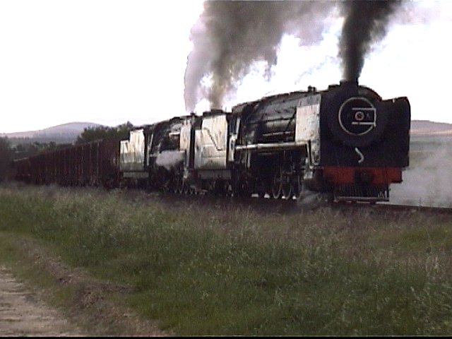station area before they hit the main line. A nice country setting between Malmesbury and Abbotsdale was the site of the next runpast. The double F's looked fantastic roaring up the hill with their nice load. As they set up for their shot, some of the passengers may have noticed a strange sight... Down in the corner of the far paddock was a plastic water tank on a trailer, and three gricers were standing nearby waiting for the train to come back. One of them climbed up on to the trailer, and another one tried to but unfortunately the trailer, being only single axle with the tank evenly balanced in the middle, tipped a bit, enough to send the tank sliding off the back. The poor guys watched as the tank slid off the trailer, through the fence and tipped its contents out down the hill... And 300 cows went over to look. But anyway, the main attraction was the double-headed F's belting back up the hill, but the sun proved a bit elusive once again. The runpast was done a few times with various degrees of success sun-wise, the only time it really came out was when the train pulled away after everyone was back on board! The sun then persisted all the way to Kalbaskraal (no runpasts in this section) - I noticed that the Saldanha junction has now had the triangular leg put back in, allowing through running of trains from Malmesbury to Saldanha without reversing at Kalbaskraal. The final runpast was near Wintervogel, again missing the sun :-( but it was still a great sight. We managed a final shot at Fisantkraal, the two F's really belting along by then after which we left the train. All pictures Copyright © 2002 Trevor Staats |