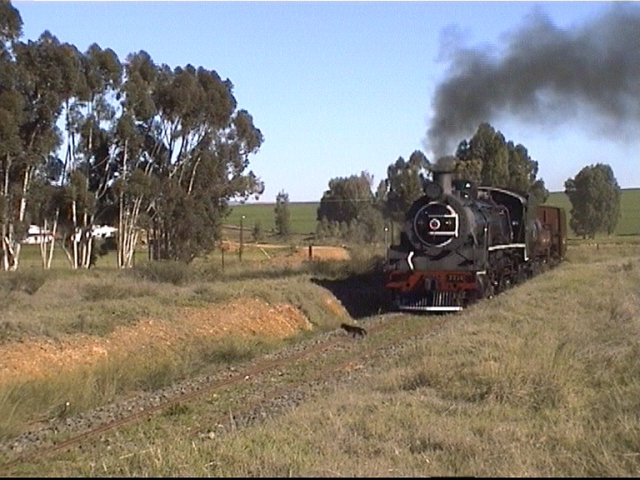 utilise our grandstand to great effect... Another couple of runpasts were held a bit further up, as we carried on to Riebeek-Kasteel. The local primary school was at break so the entire population lined the fence to observed the train's passing, all screaming louldy of course! A little further on at Riebeek-Wes a pair of 35's with a cement train waited to cross the 19D. A few runpasts later, the Dolly duly arrived and the diesels could continue along their way. We managed to drive the service road to the Berg River bridge for a shot but the road was a little rough... A shot a little further on was notable for a little black kitten scooting across the track just a few metres in front of the loco! Is is bad luck when a black cat crosses in front of a black loco?! Time for lunch so we checked out the culinary delights of Porterville, settling on a steak pie from the local Spar. Not bad. They do a mean lemon meringue pie as well! The train passengers enjoyed lunch at a local winery. Meanwhile the train had arrived, shunted and turned. There's a nice shot on a curve leaving Porterville opposite the Monte Bertha suburb with the Groot Winterhoekberge in the background. Trouble is it needed some gardening. So with a slasher and a pocket knife we set about removing some trees and an old telegraph pole. To no avail, but at least it kept us busy for a while! The shot was okay anyway. The train stopped for a runpast near the garbage dump before heading off towards Halfmanshof. One of the gents linesiding was complaining bitterly about the &*#! mountains that seemed to appear in every shot, and lamented the severe lack of cathedrals, castles, arch viaducts and tunnels in the area, as would be found in the European Alps.... I pointed out that we had photographed the Kasteelberg earlier in the day, and that the previous day I had passed many castles on the Caledon branch. I passed a Castle to Warwick, one to David, one to Dick etc. He didn't seem to get it. Unfortunately for him the mountain scenery persisted and they appeared in many shots! We managed some fantastic shots south of Halfmanshof, but in a gricing blunder we headed the wrong way near Leliedam and missed the final runpasts! Oh well, the day was still fantastic. I left the JHB gricers to carry on towards George for the weekend's action and headed back to Hermon. A final shot of 3334 arriving, and the passengers detrained and embarked on the Union Limited, 25NC 3422 patiently waiting at the head of the train. I hear that Montagu on the Friday was brilliant, but the fire risk caused problems on Saturday. Sunday on the narrow gauge was also quite good I hear. Oh, yes and I did contribute some money for linesiding! All pictures Copyright © 2002 Trevor Staats |
