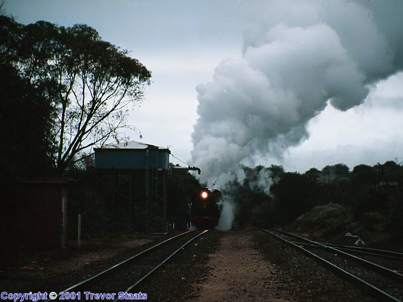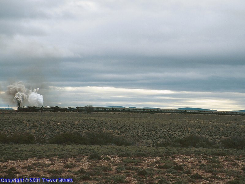 the wheel The timing was just right, but this time it was steam calling... Cloud, gloom and fog all around... It was just getting light by the time we'd reached Vlakteplaas, sunrise time was uncertain due to the thick grey crud that covered the sky from horizon to horizon. We had a walk around the station area, I was surprised to see a brick-lined turntable pit at the Oudtshoorn end of the yard - I've never seen one in this country before (well except for the new one at Knysna). The station buildings were in a state of disrepair, the floorboards from the signal box long since burned in a fire somewhere, only leaving the pit that once held the semaphore frame. In the back room the smashed remains of a Van Schoor machine was kept company by the many piles of excrement left there by locals seeking a sheltered spot to sit and think. A little later the sound of hardworking locos came echoing through the valley, and 24 3668 with 19D 3324 steamed around the bend, a hanging cloud of steam marking their passage. Going at a decent speed, they clattered through Vlakteplaas and on towards Snyberg. Their passing made a decent video shot but not good for much else. Then into the car and off in pursuit - no easy feat with the rough and windy road following the line, whilst the Dolly and 24 rode the high iron with their passengers enjoying a breakfast in the dining car, entertainment provided by yours truly trying to pilot the car through the dips, bumps and detours! Then into Snyberg where locomotive requirements were satisfied. Fires were cleaned and tenders filled. During the process a goods ran through behind 34.001, 34.009 and 34.111. The passengers seemed to be mostly from the UK, with well-known Cape enthusiast Mark Robinson presiding over the runpast organisation. After the locos were ready, a false start was held in the continuing gloom. A little further on, a runpast was held at the famous Rooiwalle. The sky had brightened sufficiently for some reasonable shots by this stage. Back on the train and a cup of tea later we were in Toorwaterpoort. Somebody was muttering something about Toorwaterpoort being in a global insurance exemption zone as we all clambered up the near sheer rocks to get the shot. The poort was a bit dim but the echo of the locos thundering through was certainly something! A few runpasts through this magnificent piece of natural stonework and the locos retreated to Toorwater station for servicing once more. The pumps worked furiously to replenish the tender water from the tankers standing on the siding, but after a while we were ready to go again. Straight through Toorwaterpoort this time and out the other side, still no sunshine. Another runpast was held at Vondeling station, the previously well-kept station building and surrounds are in ruins, with the station windows all smashed and buildings vandalised. The visiting railfans improved the situation somewhat by removing weeds and bushes from the immediate area, such is the kind-hearted nature of these railfans. The added (but by far secondary) bonus was getting a clearer shot of the train. Tantalising glimpses of sunshine on the distant mountains did not help as the train steamed through in the gloom. Back aboard once more and climbing towards Kranspoort. At the start of the poort another runpast was held, spectacular and quite moody in the prevailing weather conditions. The locos had their work cut out climbing through the gorge, but they did it in fine style and crested the summit at good speed. Every window in the train had a head sticking out of it as the passengers enjoyed the sight and sound of the climb. Next stop was at Antonie where we crossed 34.027 and 34.019 on a lengthy goods before a final runpast was held. Soon afterwards we arrived at Willowmore where 34.115 and 34.123 took over. The station here had also been thoroughly vandalised - a great shame. Back into the car again and off to Graaff Reinet and Bethesda Road. Gloomier weather set in, with heavy rain falling. We stopped at Graaff Reinet to see if the Lootsberg locos were there but the wet station yards were silent. Then onwards towards Bethesda Road, really strange weather. Freezing cold, super thick fog, rain, thunder and lightning! We eventually found the Goods Bottle Inn near Bethesda Road and checked in. The place was fairly basic but clean, and the lounge had a lovely open fire which we enjoyed after dinner. All pictures Copyright © 2001 Trevor Staats |