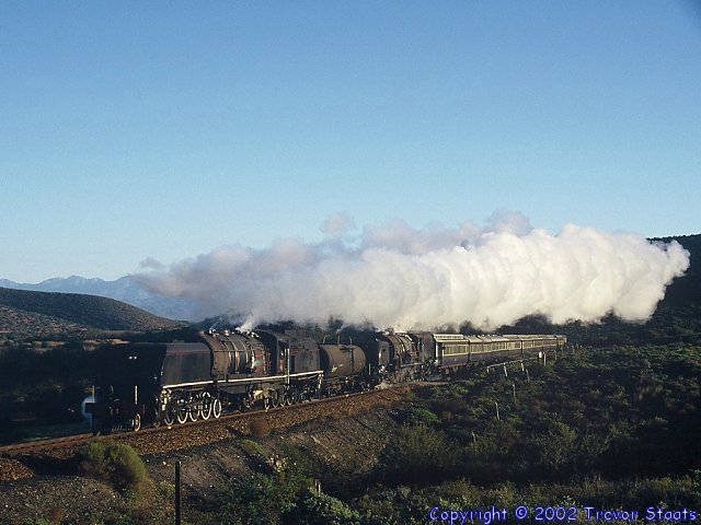 ice, and the two live Garrett's were sure pumping steam! We waited for the departure from the station, which (strangely) coincided with the sun reaching the tracks, but unfortunately the steam effects totally hid the station, locomotives, train and most other things… Around the corner out of town the steam clouds had abated somewhat, but the exhaust trail was lingering in the air all the way from the station! A superb runpast was held at the bridge near Friesland. Two glinting Garrett's with brilliant steam effects was just perfect. A couple of grabs were had before Kandelaars, and here a quick sprint from the road to the desired position was required. This was shot number three on the WFLORS, and by all accounts was a success, thereby completing the list! The station and line were in sun and the road behind still in shadow, with steam effects still magnificent. The locos were serviced at Zebra, much to our surprise as we waited on the next curve out of view, wondering why the train never arrived… In any case we decided to move to the R29 bridge a bit further up. A bunch (?) of ostriches were in the field below, and they wandered over to check us out when we stopped. We decided that these would add a nice flavour to the photo so Warwick went down to the fence to entice them closer for our picture. He enticed them with thimbles, enticed them with care; enticed them with forks and hope; he threatened their lives with a railway-share; and charmed them with smiles and soap. Which was fine, as they crowded into the corner, nicely arranged for our shot. But as soon they heard the approaching Garrett's they fled for the farthest corner of the field!!! Oh well, points for trying… Further shots were had at Holgate then at the R62 bridge near Camfer (runpast), before the normal service stop at Camfer. For some reason on this stretch the GEA was making no smoke and the GMAM producing lovely white steam effects. Looked rather strange for the photos! While they were servicing at Camfer, we drove further up the pass to the Twin Peaks shot and waited for the train. A great shot there, although it was a little hard to get the two peaks in given the smoky display provided by the Garrett's. A runpast was held here as well. At that point we bade the train a fond farewell and headed for George. Whilst descending Outeniqua Pass we saw the train coming through the Topping tunnel. A quick lunch stop in George then the drive back to Cape Town for Warwick to catch his flight back to Johannesburg. A most enjoyable few days’ gricing! All pictures Copyright © 2002 Trevor Staats |